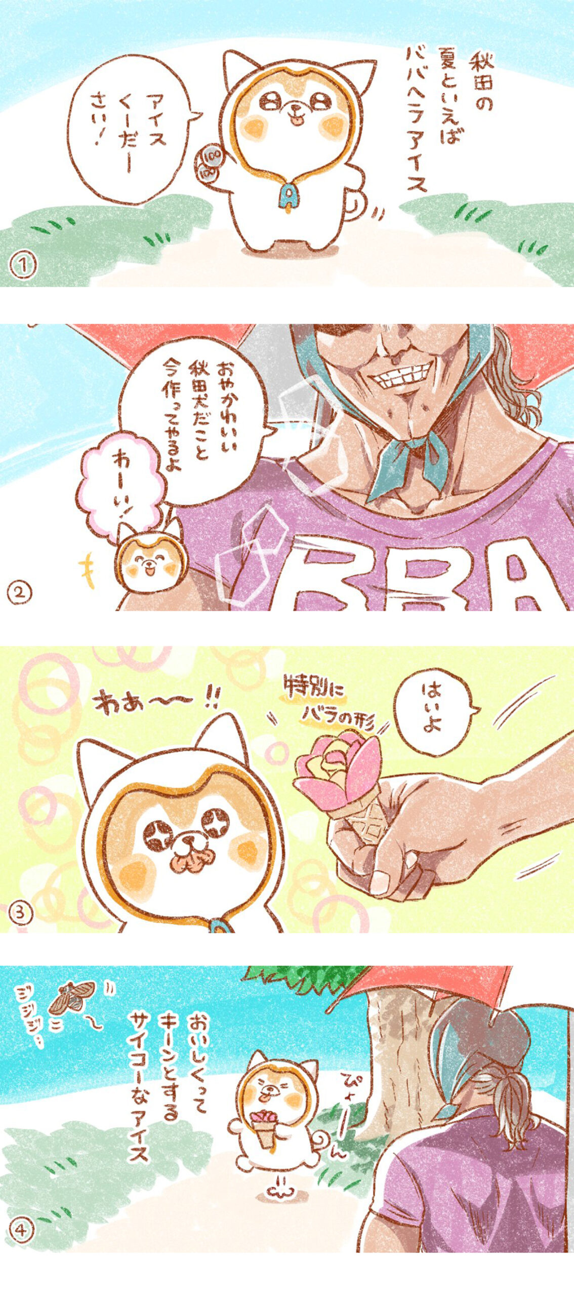 また、すでにあるキャラクターをマンガにすることも可能です。下記は一般社団法人秋田犬ツーリズム 様のキャラクター「AI秋田犬モフー」です。