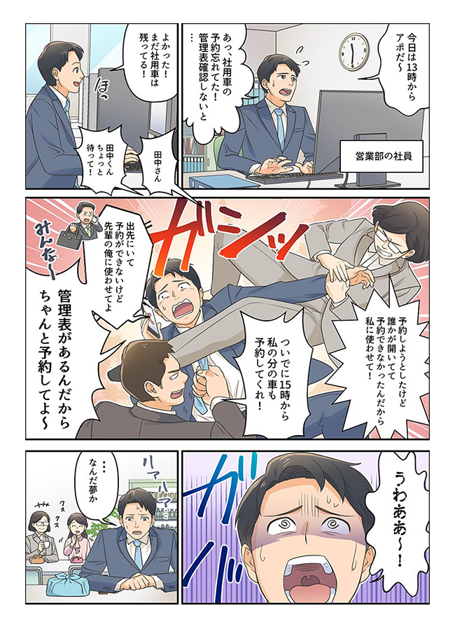 社用車の空き状況の確認、アルコールチェック、適切な車両台数の計算など、車両管理の担当者を悩ませるテーマを描写。